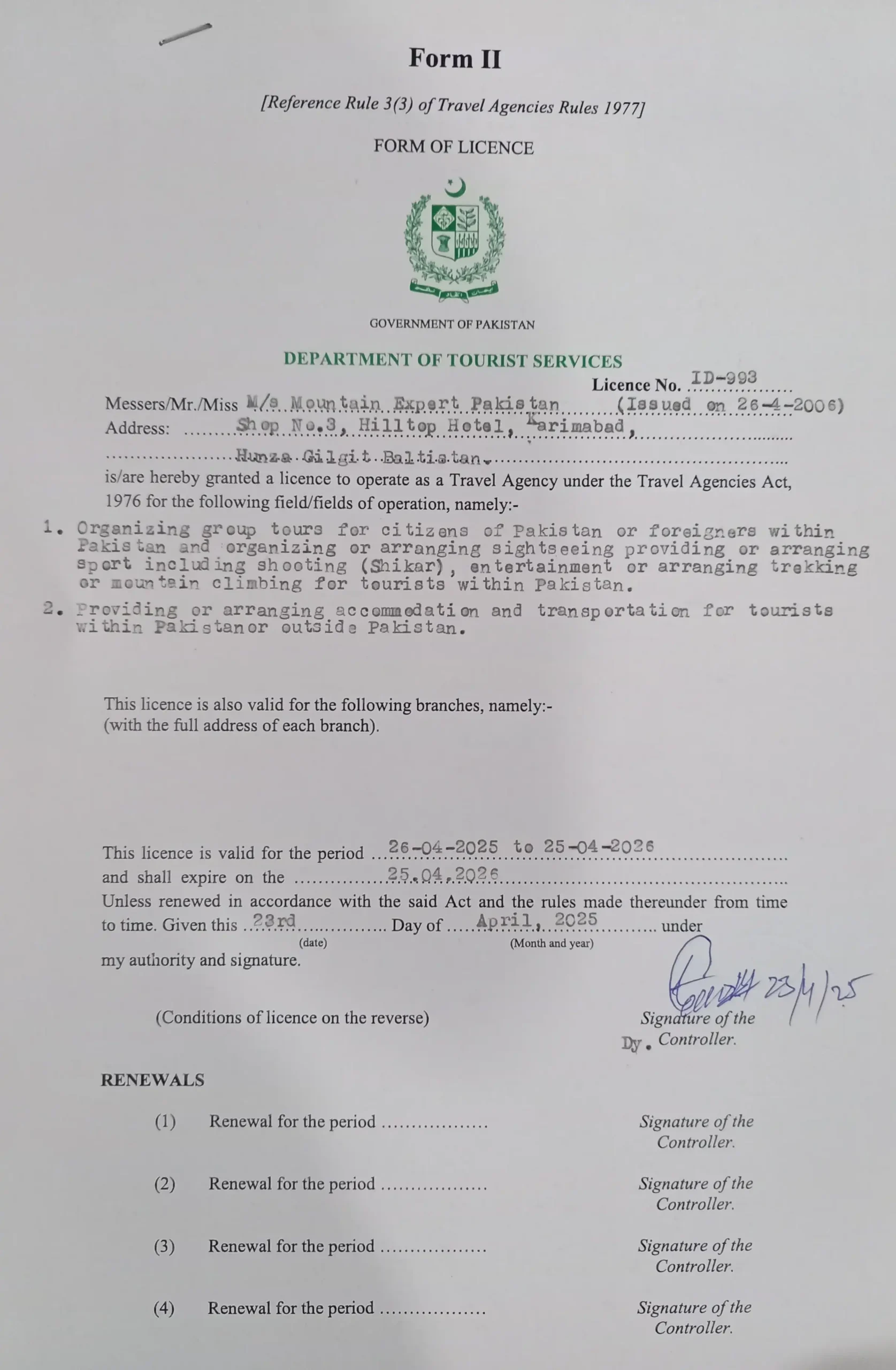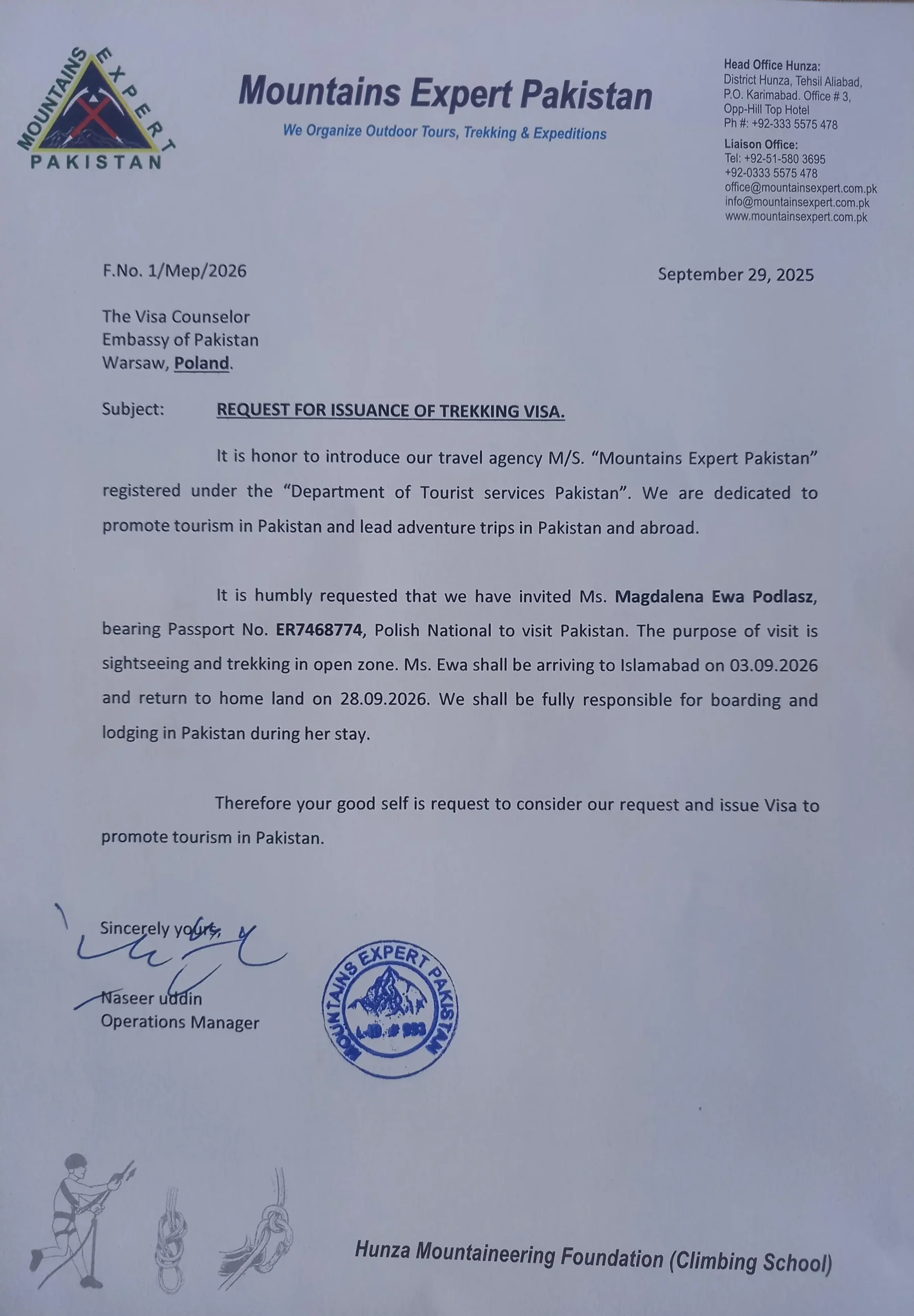 - Płatności przyjmujemy wyłącznie gotówką lub czekiem bankowym wystawionym na Mountains Expert Pakistan Trekking tours and Expeditions.